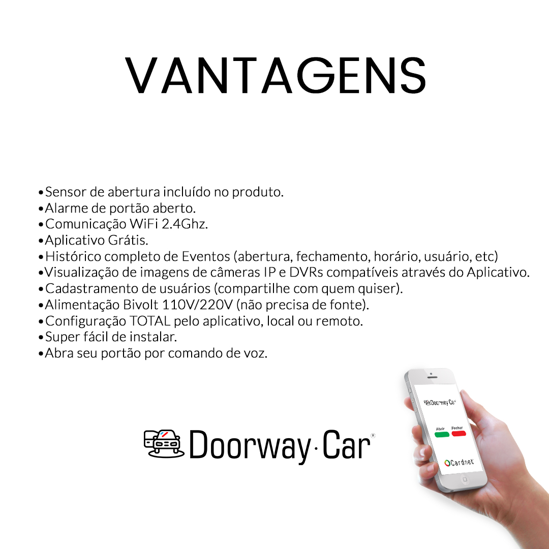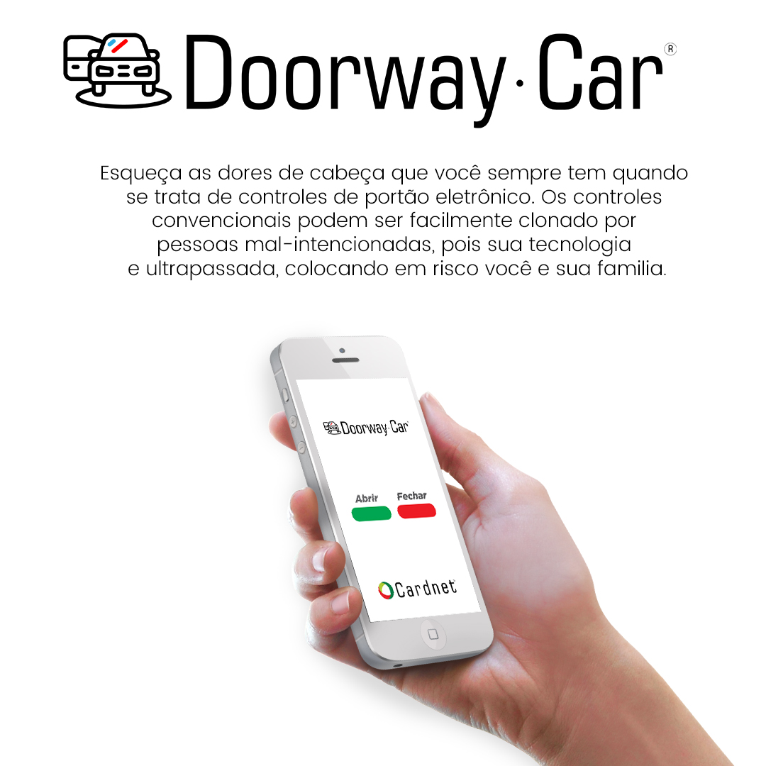 O  Doorwaycar é uma tecnologia de ponta, criada para sanar o grande problema que os antigos controles e tags de portões causavam ao deixar bandidos clonarem seus controles, tags e invadirem as casas facilmente, com o Doorwaycar você irá integrar todos os seus controles remotos em um único aplicativo para você abrir, fechar seu portão de garagem de qualquer lugar do mundo, você nunca mais vai correr o risco de ser clonado!